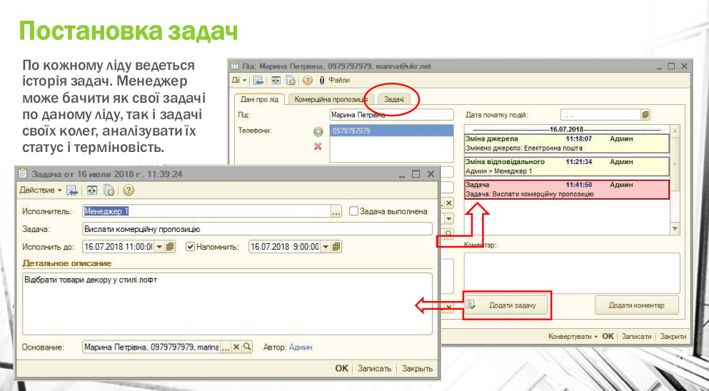 • Вся діяльність фіксуються в 1С, вся історія, зміни, переписка, всі дзвінки і пропозиції клієнтам фіксуються в 1С. Непотрібно налаштовувати додаткові обміни зі сторонніми системами.